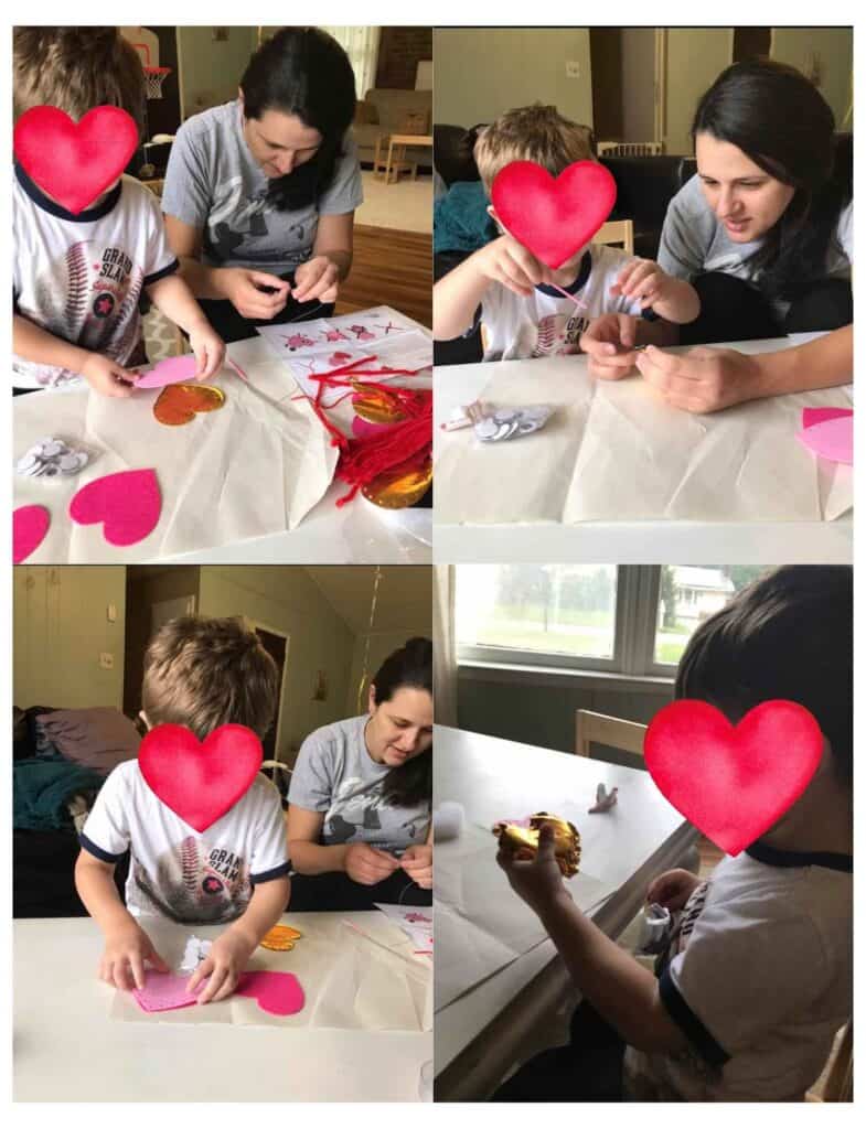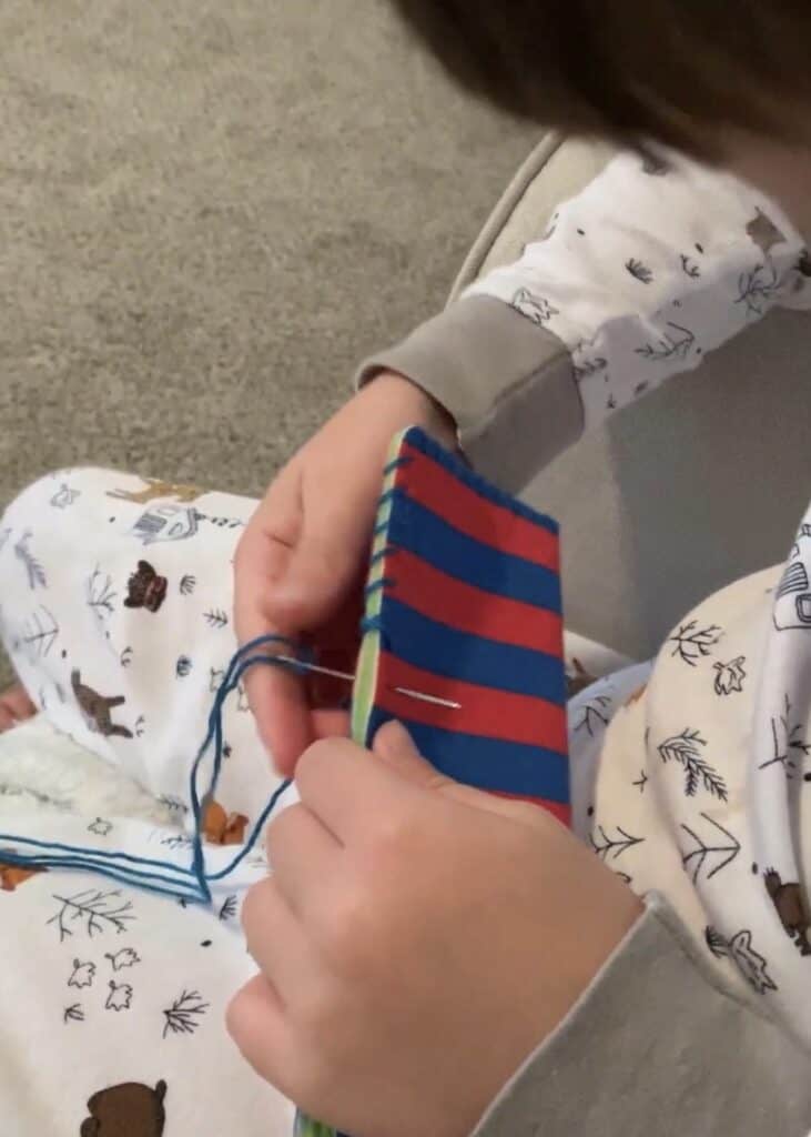 They also learn how to pull the thread all the way through and then go back the opposite way with it. This is how I’ve gotten my four kids started and it’s so fun. You can help them through at first, and the man as they’re ready, slowly let them do more and more of it until they can complete the entire animal on their own. A kit usually comes with several of these small projects to do.